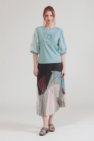 This pleated skirt with the Auralis print turns every step into a style statement. Its pleats create a play of light and shadow that enhances the print, inspired by your inner glow and the connection with your essence. With a fluid drape and a comfy waist, it’s a versatile piece you can pair with basics or other pieces from the collection for a look full of personality.